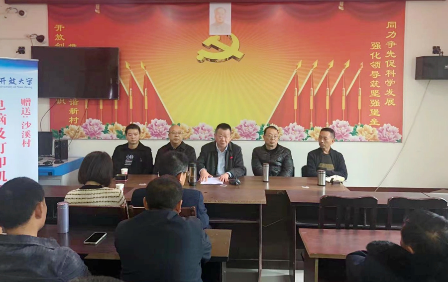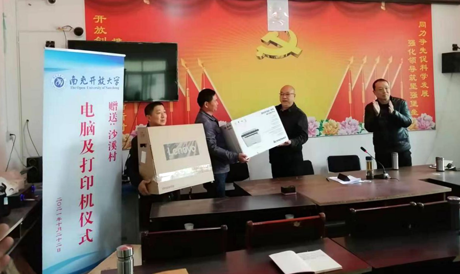 南充開放大學(xué)副校長蒲曉波、王旗代表南充開放大學(xué)為沙溪村贈送了辦公電腦及打印機(jī)。